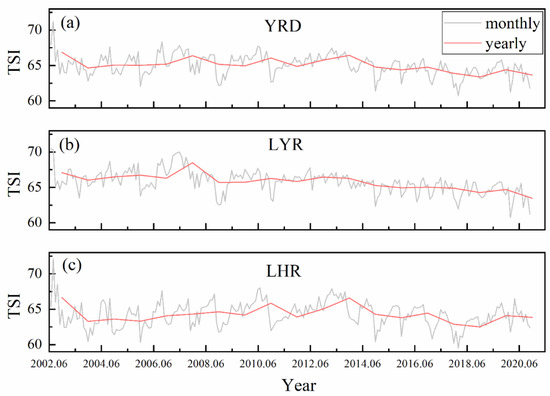 Annual and monthly changes in the TSI average from 2002 to 2020: (a) YRD, (b) LYR, and (c) LHR.