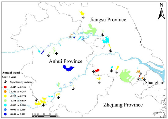The interannual variation trend of the average TSI of each lake in the YRD is illustrated in Figure 10. Annual (year−1) TSI variation rate ranges of −0.445 to −0.356, −0.356 to −0.267, −0.267 to −0.178, −0.178 to −0.089, −0.089 to 0, 0 to 0.059, and 0.059 to 0.118 accounted for 4.8%, 7.1%, 19%, 21.4%, 26.2%, 9.5% and 9.5% of all lakes, respectively. Among them, Lake Shijiu exhibited the highest decrease rate with a value of −0.445 year−1, while Lake Chaohu exhibited the highest increase rate of 0.118 year−1. Significance analysis results demonstrated that 63.4% of lakes in the YRD experienced statistically significant decreasing trends (p < 0.05). Spatially, the lakes located in the eastern parts of the YRD all have a decreasing trend, while the lakes with decreasing trends in the northern, southwestern, and western subregions accounted for 69.2%, 80%, and 83.3% of all lakes, respectively.