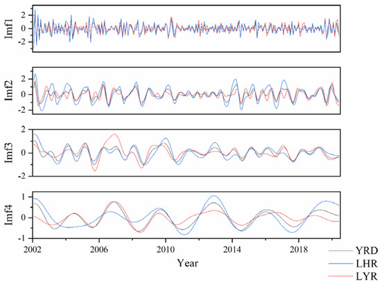 Periods and variance contribution of IMFs and the residues of TSI in the YRD, LYR, and LHR. (The unit of the period is a month, such that 3.7 months is an approximately seasonal period and 12.3 months is an approximately interannual periodicity. Residue indicates the general trends of TSI.)