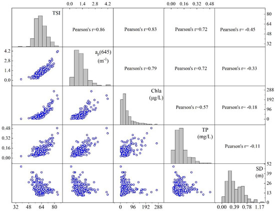 Matrix scatter of correlation analysis between TSI, ap(645), Chla, SD, and TP.