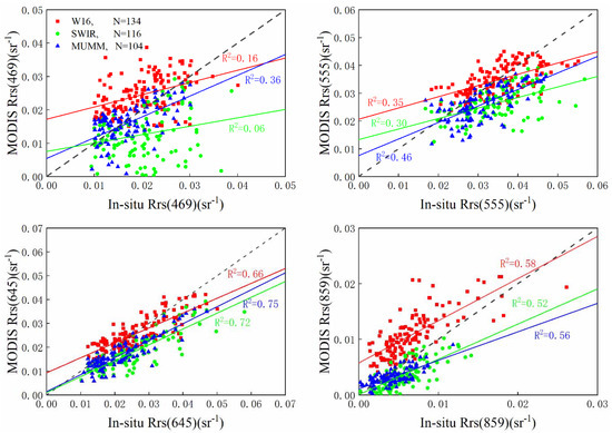 Therefore, a simple and operational correction method based on the near-infrared (NIR) and short-wave infrared (SWIR) bands for MODIS products proposed by Wang [27] was used to perform remote sensing reflectivity correction for this study. To validate the atmospheric correction accuracy in the YRD, the in-situ measured Rrs of 134 synchronized sampling points with satellite overpass date were compared with the Rrs derived from the atmospheric corrected image. Moreover, two often used methods for atmospheric correction in inland turbid waters, shortwave infrared (SWIR) [28] and the management unit of the North Seas Mathematical Models (MUMM) [29], were also selected for comparison with this method. The simple and operational correction method is shown in Equation (1):