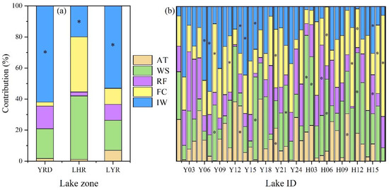 (a) The relative contribution percentages of different factors to the interannual changes in the TSI of lakes in the YRD, LHR, and LYR; (b) the relative contributions of different factors to the interannual changes in the TSI of all lakes in the YRD. Here, AT, WS, RF, FC, and IW represent air temperature, wind speed, rainfall, fertilizer consumption, and industrial wastewater, respectively, and the symbol “*” represents p < 0.05.
