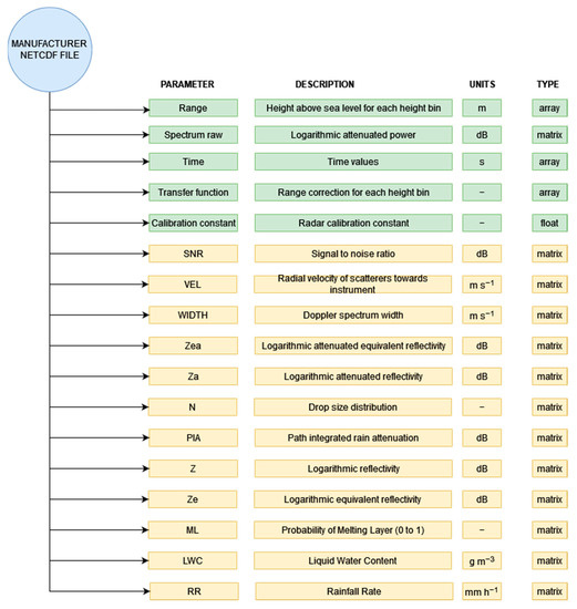 Figure 1. Description of selected parameters contained in the manufacturer’s netcdf file. Parameters in green are required by the proposed methodology implemented in RaProM-Pro.
