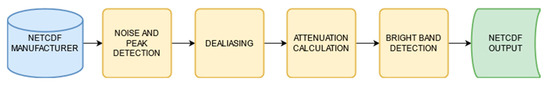 The processing method consists of the following four main stages (Figure 2): (1). removal of noise and peaks detection from the raw signal, (2). dealiasing of the spectrum to improve the detection of the vertical velocity, (3). computation of attenuation path integrated (PIA) factors and (4). calculation of radar parameters using the corrected spectrum and the BB characterisation. The results are saved in a netcdf output file. Stages (2) and (4) are particularly novel. Note that Stage (1) must be performed before Stage (2) as spectral reflectivity (ƞ), required for dealiasing, is not available in the manufacturer’s netcdf file.