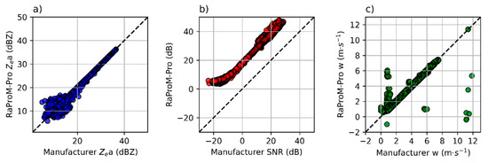 Figure 3. Scatter plots comparing the manufacturer and the RaProM-Pro processing. (a) Equivalent radar reflectivity, (b) signal-to-noise ratio and (c) Doppler vertical velocity. Data were recorded on 21 April 2020 from 10 h to 14 h UTC.