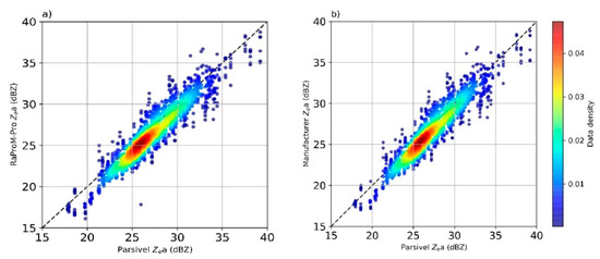 Figure 4. Scatter plots of equivalent radar reflectivity of the lowest valid height bin (150 to 200 m above radar level) of (a) RaProM-Pro and (b) the manufacturer processing vs. the Parsivel disdrometer located at the radar level. Coefficients of determination are equal to 0.878 (RaProM-Pro) and 0.879 (manufacturer) for 1195 samples. Data were recorded on 21 April 2020 from 10 h to 14 h UTC.