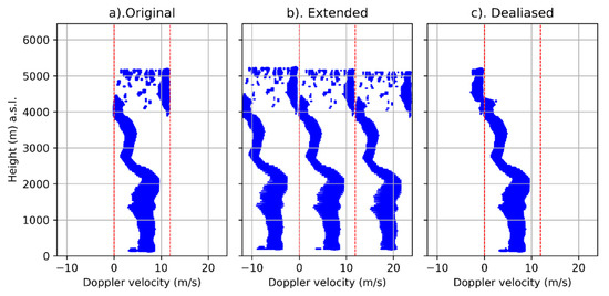 Spectral reflectivity aliasing occurs when the target returns a signal outside the unambiguous range interval. A systematic method to correct aliasing in MRR-2 was proposed by [34] and was implemented with some modifications by [31]. The two methods are based on the estimated velocity parameters calculated from equivalent radar reflectivity in [35]. Here we propose a different approach, where only signal continuity between vertical levels is used, instead of the parameters estimated in [35]. According to the manufacturer’s documentation, the radar manufacturer processing is able to detect upward movements of precipitation particles, but in some cases, this detection is not possible, and velocities are aliased. Figure 5 shows an example where the manufacturer velocity spectrum (Figure 5a) shows a suspicious pattern between 4000 and 5000 m, potentially caused by aliasing. By extending or unfolding the spectra to both sides (Figure 5b), the vertical continuity of the spectra allows a consistent dealiased spectra profile to be selected (Figure 5c).