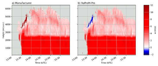 Figure 6. Time–height display of Doppler vertical velocity (positive values indicate downward direction) obtained with MRR-Pro on 16 May 2020 processed with: (a). The manufacturer’s software, (b). RaProM-Pro, which includes a new dealiasing scheme.