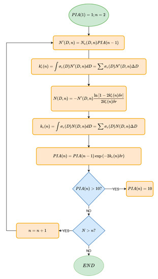 Figure 7. PIA calculation flow chart adapted from [36]. N’(D, n) and Na(D, n) are, respectively, the drop size distribution and the attenuated drop size distribution; ke is the specific rain attenuation and σe is the single-particle extinction coefficient, calculated with the Mie theory.