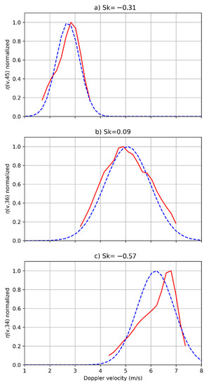 Figure 8. Examples of the Doppler velocity distribution (redsolid line) and fitted normal distribution calculated with the same average Doppler velocity and spectral width (blue dashed line) obtained at three different heights: (a). above the Bright Band (2350 m ASL), (b). within the Bright Band (1900 m ASL) and (c). below the Bright Band (1800 m ASL), on 5 December 2019. Skewness values (Sk) are given for each height.