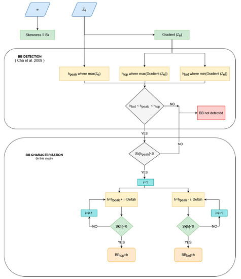 The method proposed is detailed in the flowchart shown in Figure 9, which describes, first, the BB detection approach, based on [39], and then the BB characterisation, which computes the BB top and the BB bottom. The remaining BB feature, the BBpeak, is the level located between the BB bottom and the BB top, where the skewness is maximum and should be close to the melting level. An additional checking is performed to remove BB detections of virga cases, simply verifying that precipitation reaches the ground.