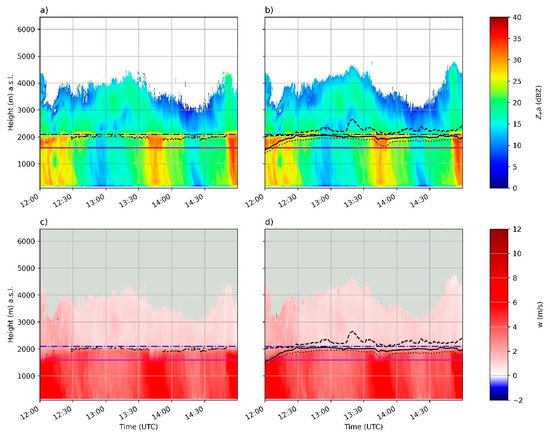 Figure 11. Time–height display of equivalent radar reflectivity—top row, panels (a,b) and Doppler velocity—bottom row, panels (c,d) calculated with the manufacturer’s software (first column) and RaProM-Pro (second column). First and second column show, respectively, the melting level detected by the manufacturer (black dots) and the BB top, BB peak and BB bottom (dashed, continuous, and dotted black lines). The data corresponds to 31 March 2020.