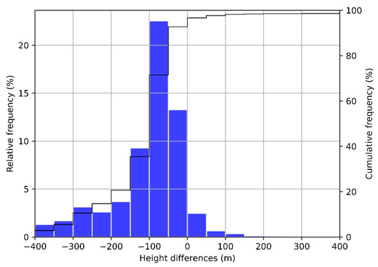 The distributions of these variables are displayed in Figure 14, similarly to Figure 13b. Both variables show similar patterns and a common main mode corresponding to the same class of height differences (−150 to −100 m) and are relatively wide (three to four different height classes). Secondary modes exceeding 5% relative frequencies are found around −300 and +400 m for Diff_peak_Man and around −500 m for Diff_Tw_Man.