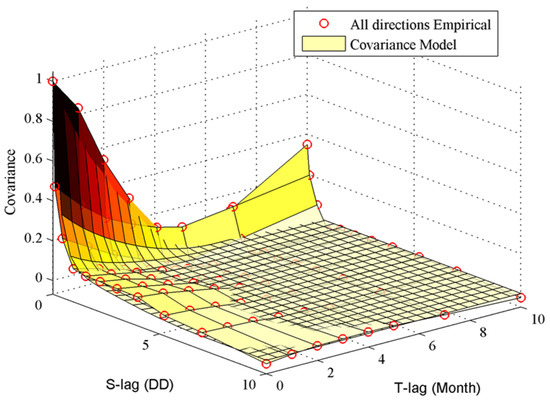 Second, an empirical spatiotemporal covariance model based on hard data and soft data was used to describe the stochastic processes affecting GOCs. A nested theoretical model consisting of two components (i.e., and ) was applied to fit the empirical covariance model.