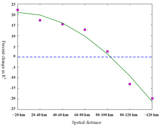 First, the monitoring sites were categorized into seven groups according to the minimum spatial lag between each monitoring site and other monitoring sites. The seven spatial lag classes were defined as 0–20 km, 20–40 km, 40–60 km, 60–80 km, 80–100 km, 100–120 km, and >120 km. and were calculated for each measured monthly average GOC. For each spatial lag class, we calculated the percent change in R2 from the GLM to the BME model (e.g., {[R2BME-R2GLM]/R2GLM} × 100) (Figure 5). A positive value indicates that the BME model performs better than the GLM; otherwise, the GLM is superior. As shown in Figure 5, the 100 km corresponding to the inflection point was elucidated as the specific distance.