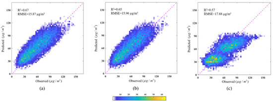 Density scatter plots of measurements and predictions for (a) hybrid model, (b) BME model, and (c) GLM (color bar represents the frequency of points).