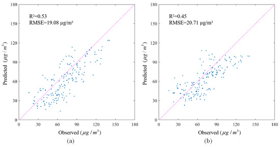 Scatter plots for (a) hybrid model and (b) BME model at locations more than 100 km from the nearest monitoring site.