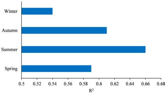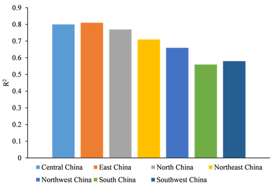 We also evaluated the predictive performance of the hybrid model for different seasons (Figure 8) and geographical regions (Figure 9). The seasons were defined as spring (March–May), summer (June–August), autumn (September–November), and winter (December–February). As shown in Figure 8, the model performance showed seasonal variation, with a lower value of R2 in winter and a higher value in summer. This result is consistent with those reported by Mo et al. (2021) [35], who predicted nationwide ground-level ozone in China.
