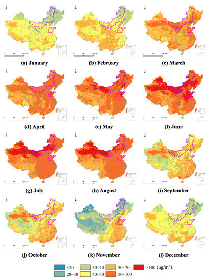 Figure 10 illustrates the nationwide monthly average GOCs at a 1 km spatial resolution for China in 2018 predicted by the hybrid model. China has a vast territory with differences in population density, economic development level, industrialization level, topography, and other aspects in various regions, resulting in spatiotemporal heterogeneity in GOCs [42,43]. Temporally, the monthly average GOCs in most parts of China showed consistent change trajectories during the study period. They exhibited an increasing trend from January to May, which was followed by persistently high levels from May to August and then a decreasing trend from August to December. Summer is the most polluted season. According to previous studies, this is mainly attributed to seasonal variations in meteorological conditions; for instance, strong solar radiation and high temperatures lead to high concentrations in summer, while less sunlight and lower temperatures inhibit ozone formation in winter [9]. Spatially, the monthly average GOCs were higher in North, East, and Northwest China and lower in Southwest China. North and East China are the population centers of China and have well-developed industries and agriculture. The large amounts of VOCs emitted from some petrochemical and organic industries and artificial sources resulted in their high GOCs. Northwest China is characterized by a high average elevation, strong solar radiation, low rainfall, and large temperature differences, which provide beneficial conditions for atmospheric photochemical reactions. The monthly average GOCs in Northwest China were particularly high in summer, while long winters with low temperatures inhibited ozone formation to some degree. Areas with relatively low monthly average GOCs were mainly located in Southwest China because local meteorological conditions (e.g., rainy and foggy, less sunlight and low temperature) and low precursor emissions were not favorable to ozone formation.