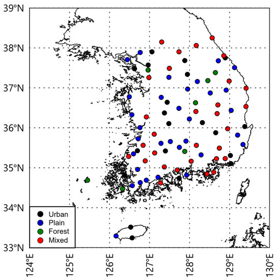 The study area included South Korea, extending from about 33° N to 39° N and from 124° E to 130° E (Figure 1). South Korea is part of Northeast Asia, which experiences four seasons with considerably different characteristics regarding atmospheric readings. There are four air masses that affect the seasons of South Korea: the North Pacific air mass, characterized by a very high temperature and very high humidity in summer; the Siberian air mass, characterized by a very low temperature and low humidity in winter; the Yangtze-river air mass, which comes from China and brings warm temperatures in spring and autumn; and the Okhotsk Sea air mass, characterized by cool temperatures and high humidity. The Okhotsk Sea air mass brings rain to South Korea during the rainy season in summer and early autumn. Additionally, South Korea is surrounded on three sides by the sea; thus, both land and sea conditions affect the region’s temperature. And especially, previous studies referred effect to cold surges by arctic oscillation [22,23]. We thought if we can retrieve Ta from satellite, the result can be used to analyze effects of arctic oscillation. For this reason, we chose South Korea as our study area to investigate the correlation between Ta and various conditions in the area.