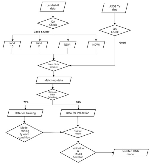 This work aimed to apply satellite data and in-situ data to the DNN model to produce an optimal DNN model for Ta retrieval (Figure 2). First, we conducted a quality check of the collected Landsat-8 data. And then, we used Landsat-8 data for application to the DNN model. All data of this study have clear weather condition and good observation condition. For this reason, we needed to check the condition of all data. Therefore we checked quality before we retrieved NDVI and NDWI in good quality and we set Band10, Band11, NDVI and NDWI to the DNN model.