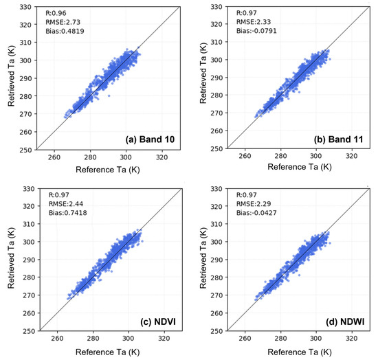 The Band 10 and Band 11 represented the emissivity of the blackbody, which differs from the actual emissivity from the Earth. For this reason, Bands 10 and 11 were used by multiplying emissivity in this study. And we applied Band 10 and Band 11 with Ta to the DNN model. The result of Band 10 was shown in Figure 3a and the R value was 0.96, and the root mean square error (RMSE) was 2.73 K and bias was 0.4819 K. The result of Band 11 was shown in Figure 3b. The R value was 0.97, and the RMSE was 2.33 K and bias was −0.0791 K. These results were shown that Band 10 and Band 11 were highly correlated with Ta.