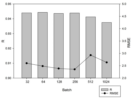Batch size, which exploits unit data size in applying the model once, has a significant impact on the accuracy of the DNN model. A batch size that is too small will result in a model that overfits the data, showing a high RMSE (Figure 4). We tested the DNN model with batch sizes applied as a multiple of 2. The input variables from the LST, NDVI, and NDWI data were identified in the previous step. We confirmed an optimal batch size of 256 over the range of batch sizes tested from 32 to 1024, with epoch 10 conditions. Given a batch size of 256, the R value was over 0.94 and the lowest RMSE was 2.35 K.