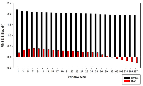Because Ta is readily altered by convection currents, the LST has a higher standard error if the Ta and LST have the same values. Conversely, surface heat transfer cannot be determined easily because there is no transmitter [52]. In a previous study, the deviation in Ta was about 0.6 K when the horizontal distance was 6 km [53]. Here, we tested 25 additional cases, varying in window size from 1 × 1 to 297 × 297, which corresponded to areas of 30 m × 30 m and 9 km × 9 km, respectively (Figure 6). We checked the changes in RMSE and bias for spatial representativeness. As the window size increased, the RMSE decreased up to a 231 × 231 window size (1.95 K). There was little difference in the RMSE after reaching a window size of 132 × 132. The difference between the RMSE values of the 231 × 231 and 132 × 132 window sizes was 0.0102 K. This variability was similar for the bias. As the window size increases, the bias decreases. The lowest bias was shown for the 132 × 132 window size. As a result, we considered that the spatial representativeness was optimal for the 132 × 132 window size, representing 4 km × 4 km, with an RMSE of 1.96 K and a bias of −0.00856 K.