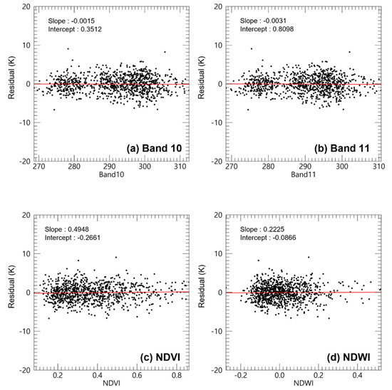 In Figure 7, the Ta difference showed little change as the individual variables were varied. The slope of Band 10 was −0.015, and the slope of Band 11 was −0.0031. Thus, the changes in Bands 10 and 11 did not affect the accuracy of the temperature calculation (Figure 7a,b). A similar pattern occurred for the NDVI and NDWI with respect to Band 10 and Band 11 (Figure 7c,d). Their slopes were 0.4948 and 0.2225. The slopes of NDVI and NDWI were larger than those of the IR bands; however, from the small amount of changes in the NDVI and NDWI, it was determined that the change in temperature was also very small.