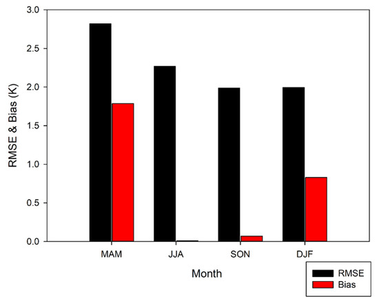 The results of the verification differed seasonally as follows: MAM (2.82 K), JJA (2.27 K), SON (1.99 K), and DJF (2.00 K), based on the RMSE; and MAM (1.7859), JJA (0.0085), SON (0.0699), and DJF (0.8295) based on the bias (Figure 8). Summer and autumn showed the highest accuracy and spring showed the lowest accuracy.