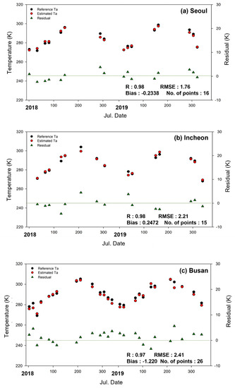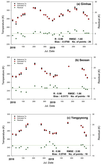 The last point was in Yangpyeong, a residential area (Figure 10c). The R was 0.99, the RMSE was 2.00 K, and the bias was 0.9749 K. Thus, Ta was retrieved with high accuracy.