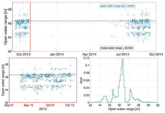 Filtering of outliers and signal spikes that do not represent physical processes is a very important step in signal processing [29]. However, raw ADCP BT data are only filtered for spikes that were caused by physical processes, such as double bounces or returns from bubbles and biota in the water column [25]. Further processing was not conducted because even single outliers of BT range values do not affect our instrument depth determination, since the instrument depth is defined as the most frequent open-water BT range value (Figure 3). Individual datapoints can still be erroneous. However, the careful analysis of the open-water data, the ADCP-internal ensemble averaging, the selection process of the instrument depth, the averaging over the four beams, as well as the final averaging to daily mean values, ensure that the impact of these outliers on the final presented data product is negligible.