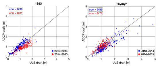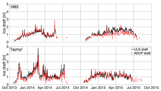 Deviations between ULS- and ADCP-derived daily mean drafts are expected, due to the different processing methods for range data from the compared systems and the different sampling frequencies of the two instruments. Furthermore, upward-looking ADCPs and ULSs were never deployed at the same location, which certainly leads to deviations in the final results as different pieces of sea ice were sampled. In addition, uncertainties in instrument depth and changes in water composition and, therefore, sound-speed variations affect the deviation of the ADCP from the ULS results and whether the ADCP draft over- or underestimates the ULS draft. Despite these influencing factors, corresponding ULS- and ADCP-derived ice draft time series show strong correlations (Figure 4). Regardless of these correlations, offsets between ULS- and ADCP-derived time series are apparent for individual data pairs (Figure 6 and Figure 7). These offsets are not consistent for the four presented data pairs and therefore cannot be attributed to general deficiencies in the presented method of deriving sea ice draft from upward-looking ADCPs. In fact, underestimations of ADCP results from stations Taymyr-13/14 and 1893-14/15 potentially result from a sensor-specific bias. Data from these two stations originate from the same ADCP sensor (RDI ADCP 300 kHz, serial number: 12667) and the mean percentage deviations (18.90 and 21.36%) and mean underestimations (0.25 and 0.29 m) of the two datasets are of a similar magnitude. After the recovery in autumn 2014, the Taymyr mooring was redeployed at the 1893 mooring site for the 14/15 sampling period. The assumption that the offset is systematic, induced by the specific sensor, is confirmed by the fact that the correlation coefficients from the respective data pairs are not affected. Correlation coefficients between ULS- and ADCP-derived ice draft time series are 0.89 and 0.80, respectively. While the 1893-13/14 ULS followed the same deployment–redeployment pattern, the ADCP sensor was substituted and a new sensor was deployed at the Taymyr station for the 14/15 sampling period. The corresponding mean differences between the two ULS- and ADCP-derived time series indicate a comparably small overestimation by these ADCPs. On average, the unbiased ADCP-derived daily mean drafts overestimate the ULS drafts by approximately 0.1 m.