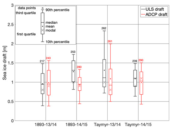 Boxplots for daily mean sea ice draft data, derived from ULS (black) and ADCP (red). Boxes indicate first and third quartiles, while whiskers show the 10th and 90th percentiles of the daily mean ice draft. Filled circles display means over the sampling period, while the horizontal dash gives the median values. The cross-marker provides modal draft values that were evaluated in 0.1 m bins and the number gives the number of datapoints that went into the statistics. Data are shown for the stations 1893 and Taymyr and for the two sampling periods 2013–2014 (13/14) and 2014–2015 (14/15).