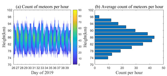 Figure 1a shows the number of meteors detected by the meteor radar at the Kunming Observatory from day 26 to 39 in 2019. Meteors were detected from 74 km to 98 km, but the area with the most meteors was distributed from 78 to 90 km. Figure 1b is the average number of meteors at various altitudes during this period. Generally, the peak meteor height distribution observed by the 53.1-MHz meteor radar during the winter was close to 87 km [23,25]. The average numbers of meteors from 76 to 98 km were more than 10 per hour, and the average number of meteors at 86 km reached ~43 per hour.