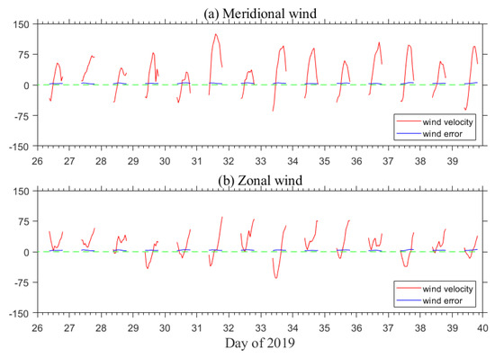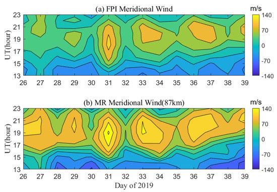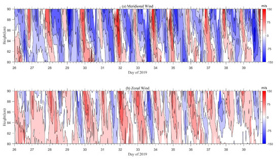 (a) is the meridional wind from 80 km–90 km height observed by meteor radar in Kunming Observatory from 26 January to 8 February 2019, and (b) is the zonal wind.