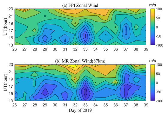 Figure 3b shows the zonal wind observations during days 26–39 by the FPI 892.0-nm channel, which represents the wind at ~87 km with a temporal resolution of ~40 min. The observed zonal wind at 87 km showed a decreasing tendency, firstly, which then increased after a minimum value. For example, the eastward wind speed was approximately ~50 m/s at 13:00 UT on day 26, which dropped to ~2 m/s at 17:00 UT. The wind speed started to increase after that and reached the maximum value of 50 m/s at 23:00 UT. The trend of the zonal wind on day 27 was mostly similar to that on day 26. The eastward wind speed was ~29 m/s at 19:00 UT and then decreased to a minimum value of 11 m/s at 19:00 UT. After that, the wind speed kept rising and reached 94 m/s at 23:00 UT. Nevertheless, the zonal wind exhibited day-to-day variabilities. For example, the zonal wind decreased and increased repeatedly on days 28, 36, and 38. The eastward zonal wind reached the greatest value of ~75 m/s on day 31, while it was only ~10 m/s on day 29. The westward wind reached a minimum value of ~-75 m/s on day 33, while the zonal wind was always eastward on days 26, 27, and 36. We compare the horizontal wind observations by the FPI 892.0-nm channel with the meteor radar observations during the same time in the next section.