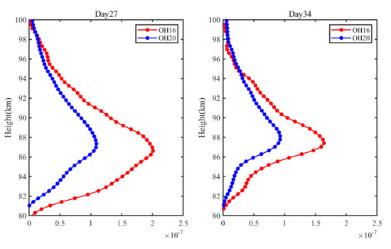 Figure 6 shows that the horizontal wind observations from the 892.0-nm OH airglow emission were most relevant to the meteor radar neutral wind observations at 87 or 88 km. This is possibly because the 892.0-nm airglow emissions peaked at heights between 87 and 88 km. The SABER instrument on board the TIMED satellite can measure the OH emissions at two channels, 1.6 μm and 2.0 μm [26]. The authors of [27] pointed out that the emission peak heights of different vibration levels were different, and the bands originating from higher vibration levels had higher emission peak heights. Figure 7 shows the concentration distribution of the 1.6- and 2.0-μm OH emissions on days 27 and 34, from which we can see that the OH emission at these two channels peaked between ~86 and 88 km. The peak height of the 892.0-nm OH emission is, thus, also likely to be close to between 86 and 88 km.