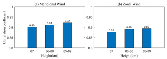 To study the relationship between the temporal variations in the FPI and meteor radar horizontal winds, we performed a two-dimensional correlation analysis on the wind data sets presented in Figure 4, Figure 5 and Figure 6 shows the temporal correlation coefficients between the FPI and observations and meteor radar observations during days 26–39 at different heights. Note that the meteor radar has a vertical resolution of 1.8 km, and the wind values at every height are estimated by accounting for all the meteors in a 1.8-km grid. In the zonal direction, the correlation coefficient between the FPI and meteor radar winds reached a peak of 0.88 at 87 km, which is only slightly larger than the correlation coefficient of 0.87 at 86 km. The correlation coefficients decreased significantly below 86 km and above 87 km with values of only 0.77, 0.83, and 0.78 at 85, 88, and 89 km, respectively. In the meridional direction, the correlation coefficient reached the highest value of 0.91 at 88 km, which is slightly higher than the peak height of 87 km for the zonal component. At 87 km, the correlation coefficient for the meridional wind was ~0.9, which is also larger than the value of 0.88 for the zonal component at the same height. Moreover, the correlation coefficients for the meridional wind component at 85, 86, 89 km were ~0.75, ~0.84, and 0.86, respectively. The meridional wind component had a better correlation relationship than the zonal component. Generally speaking, our results are similar to those achieved by the authors of [20], who compared the FPI and meteor radar observations at a high-latitude observatory (King Sejong Station (KSS), (62.22°S, 58.79°W)). They showed that the correlation between the meteor radar and FPI at KSS were 0.88 and 0.92 for the meridional and zonal wind components, respectively, which generally agrees with our analysis results. However, the authors of [21] showed that the correlation coefficients were only 0.28 for the zonal wind and 0.36 for the meridional wind at 87 km at KSS by analyzing the FPI and meteor radar observations during 2017, which is much smaller than the coefficients in our analysis. Currently, we are not sure about reasons for the discrepancy.