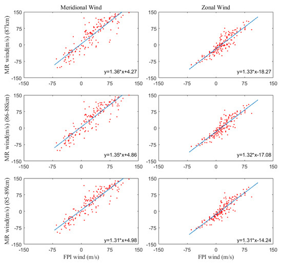 The correlation coefficients in Figure 6 represent the temporal consistency between FPI and meteor radar wind observations, which were between ~0.8 and 0.9 for both the zonal and meridional components. Hereafter, we will investigate the relationship between the absolute values of FPI and meteor radar wind observations. Figure 9 shows the scatters of the FPI and meteor radar observations, as well as their linear fitting results. There was a strong linear relationship between meteor radar and FPI results, though the observation results of meteor radar were larger than that of FPI. The slope of the linear fitting was between ~1.36 and 1.33 for meteor radar meridional and zonal winds at 87 km, respectively, which means that the meteor radar observations were ~1.3 times as great as the FPI observations. The FPI instrument measures the averaged wind values of the whole airglow layer. For example, the 892.0-nm FPI channel measures the airglow emission of OH, which lies between 80 and 100 km with a peak value at ~87 km (Figure 7). The 892.0-nm channel FPI wind observation is, thus, the averaged wind value between 80 and 100 km, though we usually take it as the wind value at ~87 km. However, the meteor measures the wind at every vertical grid, e.g., 85 km, 86 km, and 87 km. The meteor radar wind observation at 87 km was, thus, larger than that measured by 892.0-nm FPI channel. Nevertheless, the slopes became smaller when the weighted (by airglow emission) meteor radar winds were utilized (Figure 10). For example, the weighted meteor winds between 86 and 88 km were ~1.35 and ~1.32 as large as the FPI 892.0-nm observations for meridional and zonal components, respectively; the weighted meteor wind between 85 and 89 km was ~1.31 as large as the FPI 892.0-nm observations for both meridional and zonal components. This means that the absolute values of FPI and meteor radar observations become a bit closer when a much thicker OH layer is considered.