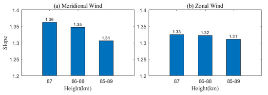 The slopes of the linear fitting in Figure 9 between FPI and meteor radar (a) meridional and (b) zonal wind observations.