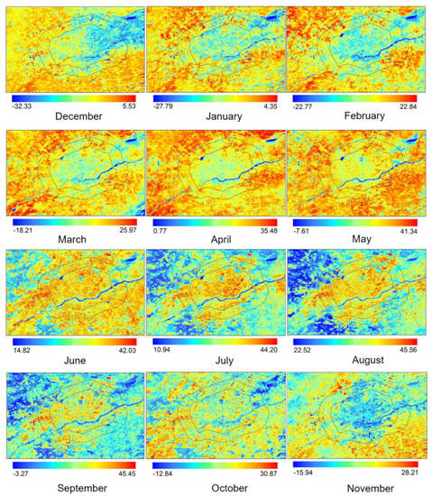 This study revealed that in July and August, Shenyang underwent the worst thermal environments with the highest LST, and both December and January were the coldest months throughout the year. Shenyang underwent an obvious heat island phenomenon in summertime, while it had a longer period of cool island phenomenon from November to May. In comparison, both June and October were transition months, implying cool–heat and heat–cool island alterations, respectively. Such results, on the one hand, indicate the dependency of LST and SUHII on month variations because of solar incidence, cooling performance and thermal inertia of vegetation and water bodies, aerodynamic properties and their interactions with urban form (e.g., materials, typology). On the other hand, LST and SUHII have been important indicators for the quantification and assessment of urban thermal environment and heat stress so that an appropriate selection of the month for study is essential, in order to avoid an underestimation of heat-related impacts and hazards. For instance, whilst June and September were also typical months in summer and autumn, the LST and SUHII were much lower than those in July and August.