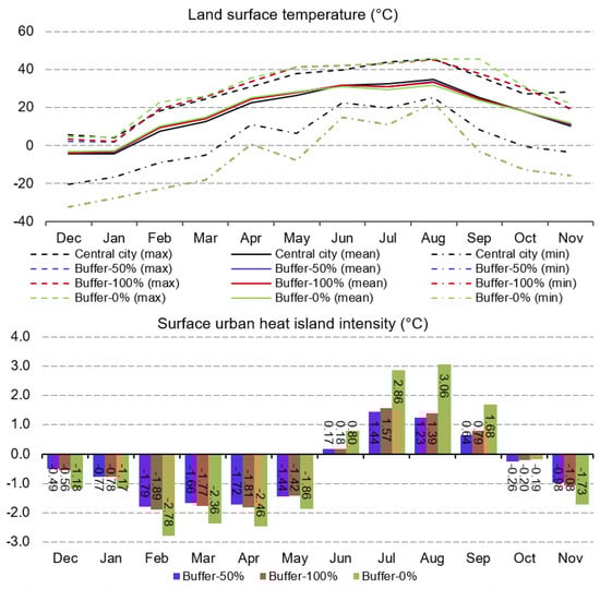 Both maximum and minimum LSTs exhibited different patterns, in aspect of the temperature order of Central city, buffer 50%, buffer 100% and buffer 0% scenarios. Regarding the maximum LST, the Central city had the lowest value from February to October and the rural (buffer 0%) area had the highest value from January to October, compared with those of buffer 50% and buffer 100%. Nevertheless, the central city had the highest minimum LST throughout the year and the buffer 50%, buffer 100% and buffer 0% areas had the same LST. The minimum LST of Central city was about 2.86–13.72 °C higher than those of buffer 50%, buffer 100% and buffer 0% scenarios.