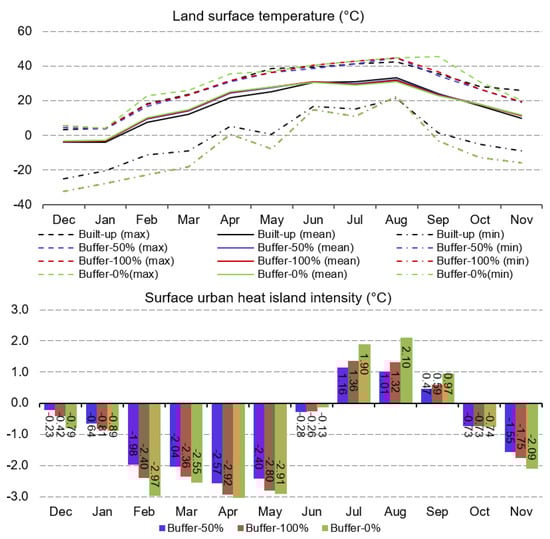 Figure 4 presents the monthly variation of temperature with respect to the three-ring area, while Figure 5 presents monthly variation of LST of the built-up areas and those of SUHII, in buffer 50%, buffer 100% and buffer 0% scenarios. Overall, the monthly variation of maximum, mean and minimum LSTs in the case of built-up area (Figure 5) were similar to those in the case of three-ring area (Figure 5). For instance, the urban area (built-up area) had the highest minimum LST and buffer 50%, buffer 100% and buffer 0% areas had the same LST. From July to September, the mean LSTs of the built-up area was much higher, while the ones of the built-up area were lower from October to June. SUHII based on the built-up area also exhibited a similar pattern to that based on a three-ring area. July and August underwent the highest SUHI effects, and February, March and April had the most intense cool island impacts. However, the cool island phenomenon in May was also obvious, with a SUHII of 2.91 °C (Buffer 0% scenario). June underwent cool island effects according to the built-up area (Figure 5), different from heat island effects according to the three-ring area (Figure 4). Under such conditions, June, September and October were the transition months with very weak heat island or cool island phenomenon. In addition, the SUHII in the buffer 0% scenario was the strongest, followed by the buffer 100% scenario and then buffer 50% scenario.