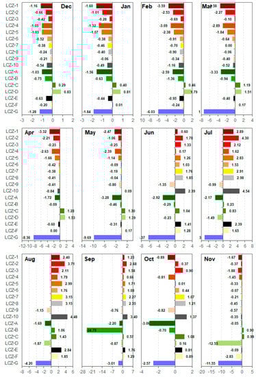 For land-cover LCZs, the Water (LCZ-G) and Dense trees (LCZ-A) were the strong heat sinks throughout the year, while in other studies, the Water (LCZ-G) could be heat sources in winter because of its high inertia [42]. Such results were consistent with previous studies that water bodies and forestry land were conducive to lowering urban temperature [23]. Moreover, icing and snow, in combination with Water and Dense trees, fostered its lowest LST in winter. Nevertheless, the contribution of other land-cover LCZs varied temporally. The Bare rock and paved (LCZ-E) was a heat source in warm months (e.g., from June to October), while it was heat sinks from December to May (Figure 6). Such results may be relevant to the capability of heat absorption and storage of rock and paved materials (e.g., stone, concrete, asphalt) in summer, while in winter the higher radiative capacity, compared with other land-cover LCZS, made it have a lower temperature. Likewise, the Low plants (LCZ-D) made different contributions depending on cold or warm seasons, where it was a heat source from December to May and it was a heat sink from June to November. This result might be relevant to the growth cycle of low vegetation (e.g., rice with irrigation, grass), where in warm months vegetation grows and generates cooling performance, while it changes to the land with dry grasses (e.g., straw, detritus) contributing to heat sources in cold months. Such a result may imply a change of LCZ types in different months.