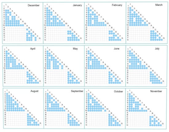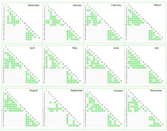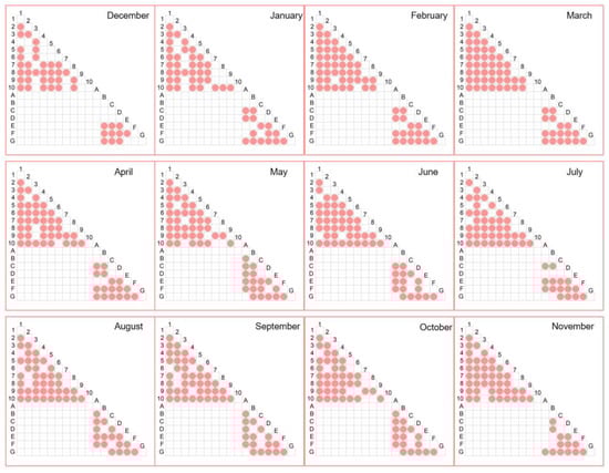 Table 6 also presents the capability of the LCZ scheme in differentiating urban temperatures of urban and rural areas. It is observed that the built LCZs had the strongest capability in March by differentiating 95.6% of the urban temperatures. Following this, in both February and November, the built LCZs could differentiate 91.1% of the urban temperatures. However, the weakest capability was observed in December where only 71.1% of the urban temperatures was distinct significantly. The capability of built LCZs was far weaker when differentiating rural temperatures, compared with urban temperature. The strongest capability of built LCZs in differentiating rural LSTs was found in July, with 89.9% of the temperature distinguishable. However, only 48.9% of the temperature was differentiated by built LCZs in December, indicating the weakest capability. Moreover, the land-cover LCZs, compared with built LCZs, showed a much weaker capability in differentiating LSTs. The strongest capability of land-cover LSTs was recognized in May, with 85.7% of (urban) LSTs differentiable, while the weakest, with only 47.6% of the (urban) LSTs distinguishable, was observed in December. In July and August, the rural land-cover LCZs exhibited the strongest capability (95.2%), while the lowest (57.1%) was found in September.