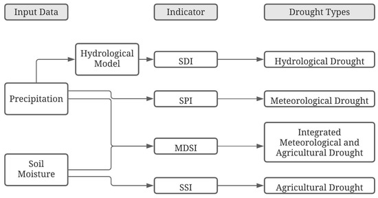 Schematic view of the general concept of using drought indices to monitor various types of droughts (SPI: standardized precipitation index, SDI: streamflow drought index, SSI: standardized soil moisture index; MDSI: multivariate drought standardized index).