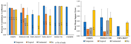 The present study used the Koppen climate classification [41] to evaluate the effect of the climatic zone on the performance of SPPs in drought monitoring. Koppen climate classification consists of five major groups and multiple subtypes within each main group. This study focuses only on the main five major groups to evaluate SPP’s performance. The Koppen climate type of the study location is directly extracted from the paper if mentioned; otherwise, the latitude and longitude of the study location are overlayed on the shapefile of the World Koppen climate map in ArcGIS to obtain the climate class type of the study location. Figure 3 shows the flowchart of the methodology used to evaluate the suitability of SPPs in monitoring meteorological drought across various climate types. SPI 3 and SPI 6, the two most reported timescales in the selected literature for this study, were considered for the analysis. The Pearson correlation coefficient (PCC) and the root mean square error (RMSE) were used as metrics to evaluate the performance of SPPs. These metrics are expressed as follows: