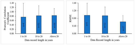 To evaluate the effect of data record length on the performance of SPPs in drought monitoring, SPI values obtained from different record lengths were assessed. The studies were grouped into three categories: (a) study with a data record length of less than 10 years, (b) study having data record length between 10 to 20 years, and (c) study with a data record length of more than 20 years. PCC and RMSE were used as metrics to evaluate the performance of SPPs.