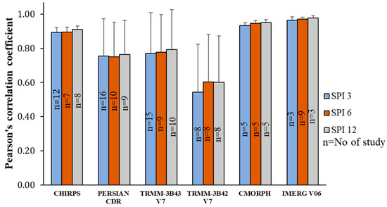 To obtain the complete picture of the various drought events, SPI is recommended to be calculated at different time scales [47]. As seen from Table 2, Table 3 and Table 4, some studies focus only on a single timescale, while others focus on multiple time scales. The present study thus evaluates the performance of SPPs for drought monitoring at different time scales. Multiscale comparison through the Pearson correlation index shows no difference in the performance of SPPs across different time scales, although a slight improvement was noted as the time scale increased from 3 to 12 months for all SPPs types (Figure 7). This is further supported by the analysis of variance (ANOVA), indicating no significant difference among the different time scales (p > 0.05). These findings suggest that the scale has no large influence on the effect of SPPs for drought monitoring, as the best performance can be achieved at multiple time scales of interest [26].